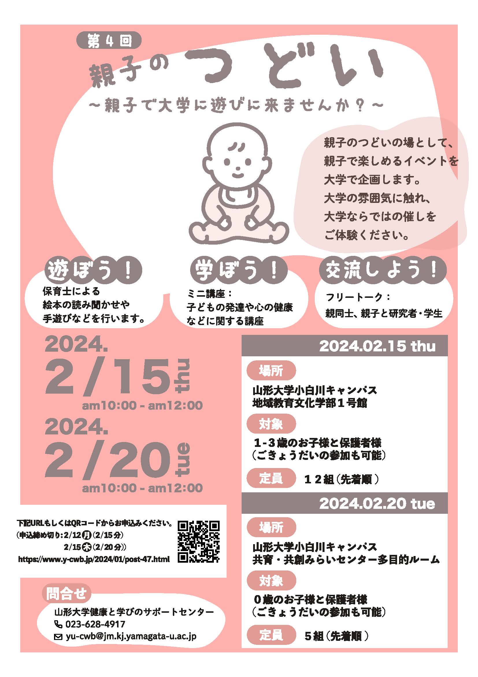 【山形大学】第4回 親子のつどい~親子で大学に遊びに来ませんか?~ 2024 1/24 2024年1月24日 大学での子育て支援の取り組みとして、乳幼児の親子を対象とした交流イベントを実施します。遊び、講座などを通して、親子と大学研究者、大学院生、学生との交流を図ります。詳しくはこちら